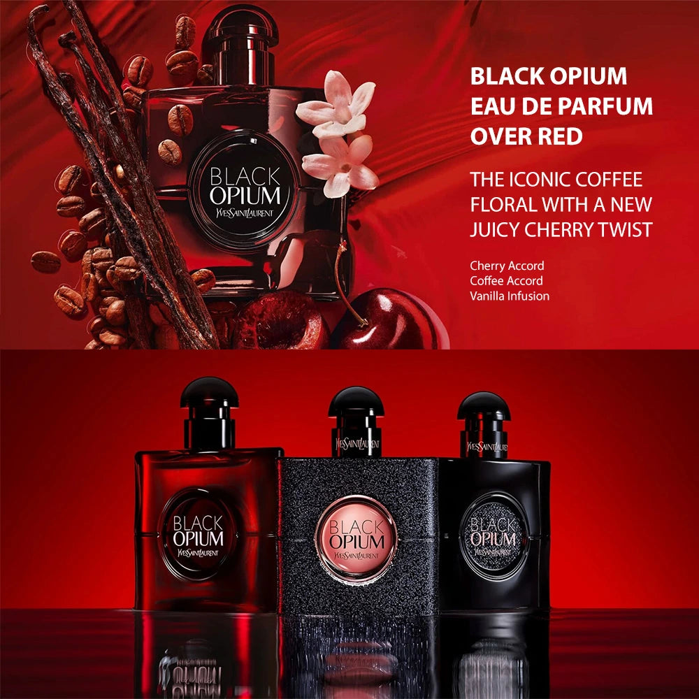Experience a daring and sensual adventure with Yves Saint Laurent's Black Opium Over Red perfume. With a luscious cherry accord, this iconic scent captures the senses and lasts all night long. The warm and sweet fragrance comes in a luxurious dark red bottle, matching the cherry note. Ambery Fruity Gourmand fragrance family.