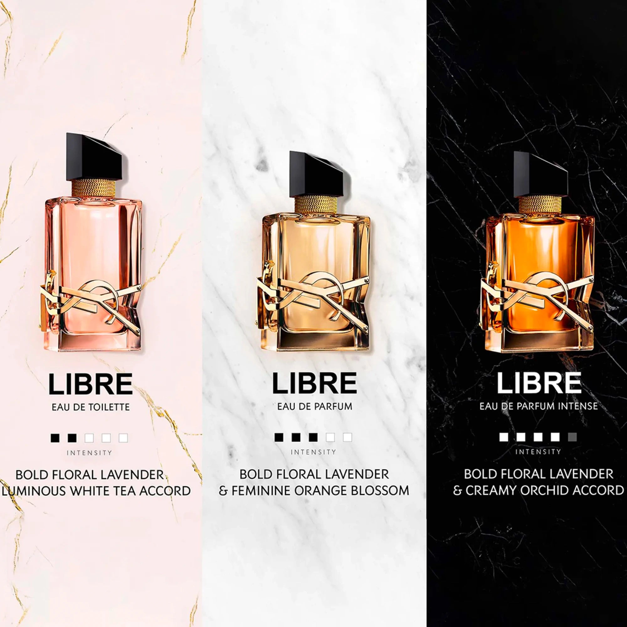 LIBRE Eau de Toilette is a bright and floral women's fragrance. A fresh interpretation of the iconic Eau de Parfum, this feminine perfume has bursts of French Lavender Essence and Moroccan Orange Blossom that combine with an icy White Tea Accord to create a modern and youthful scent.